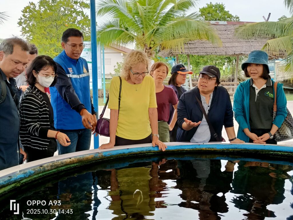 The delegation visited the Phetchaburi Aquaculture Demonstration Farm and two private enterprises — Family Farm and Khun Chai Farm — to observe cultivation models and challenges in practice.