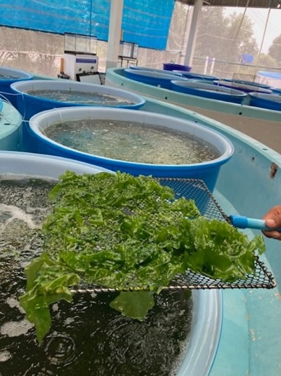 At Family Farm and Khun Chai Farm, the team observed commercial-scale cultivation of sea grapes and sea lettuce. Family Farm operates both crops, with sea grapes grown in repurposed clay ponds formerly used for shrimp, and sea lettuce cultured in tanks. Khun Chai Farm focuses solely on sea grape cultivation in clay ponds.